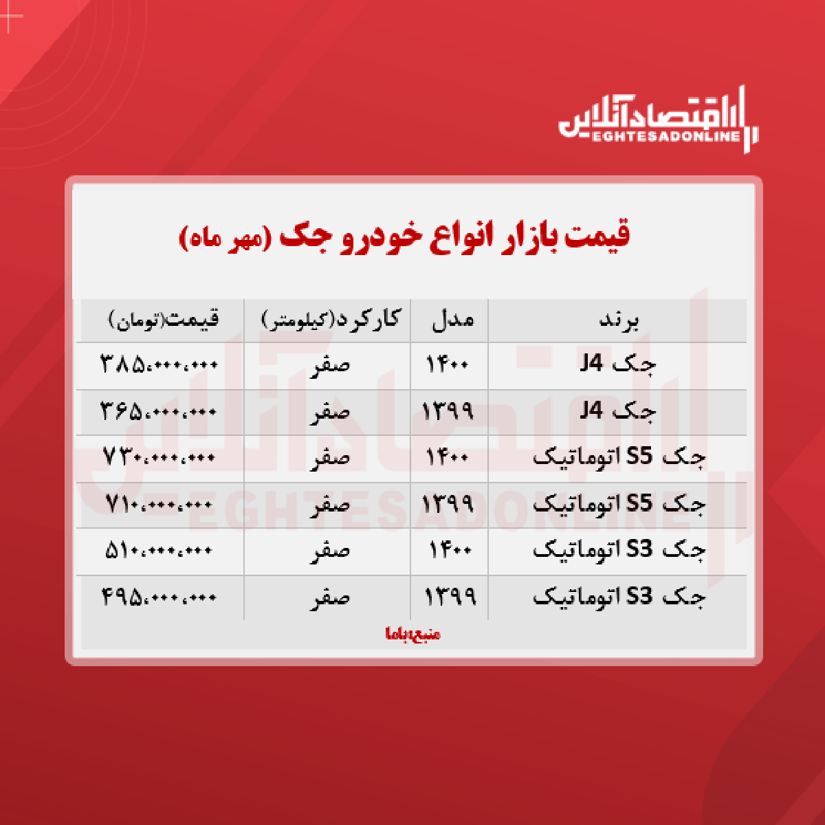 قیمت خودرو جک + جدول