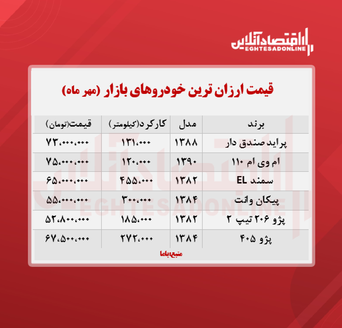 اقتصاد آنلاین - پیام مصطفایی: در جدول زیر قیمت روز ارزان ترین خودروهای دست دوم در بازار آزاد را مشاهده میکنید.