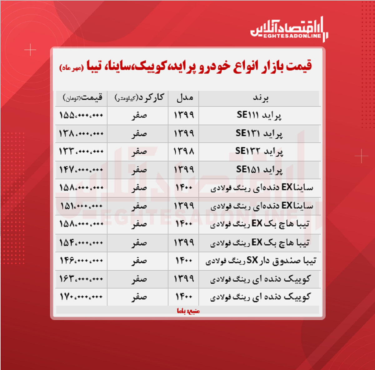 اقتصاد آنلاین - پیام مصطفایی: در جدول زیر قیمت روز انواع پراید، تیبا، کوییک و ساینا در بازار آزاد را مشاهده میکنید.