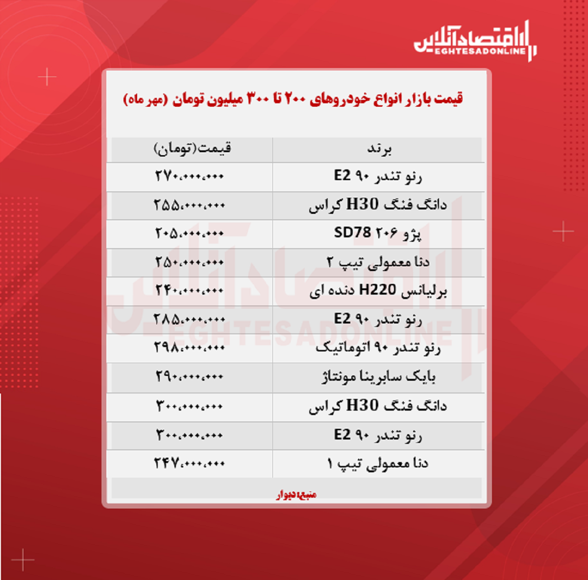 خودروهای ۲۰۰ تا ۳۰۰ میلیون تومان بازار (۱۴۰۰/۷/۱۵)