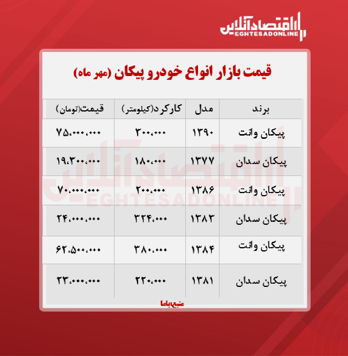 قیمت روز پیکان (۱۴۰۰/۷/۱۶)