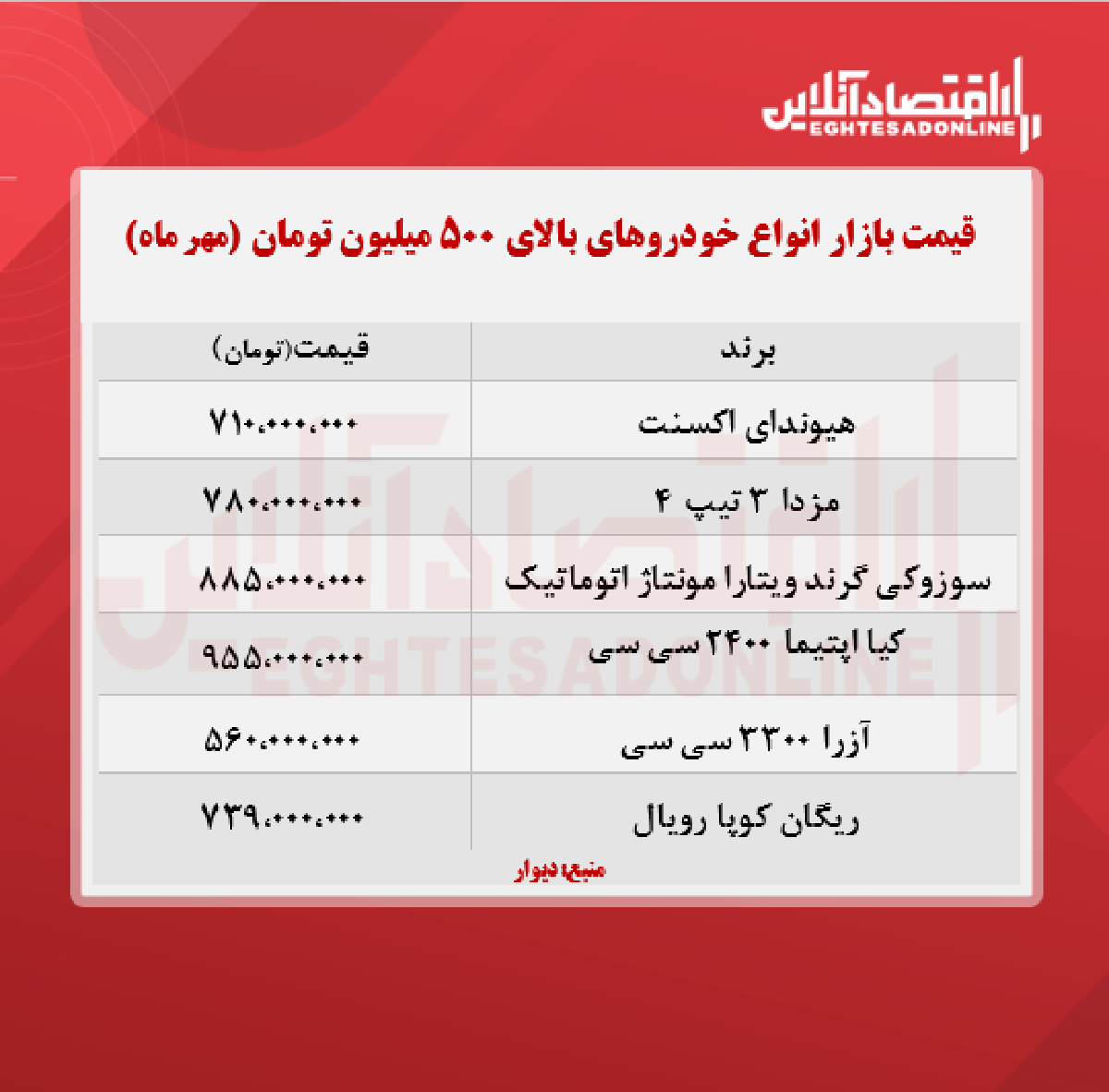 انواع خودروهای بالای ۵۰۰ میلیون تومان (۱۴۰۰/۷/۱۷)