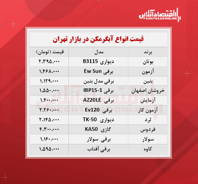 اقتصاد آنلاین -سمانه باقری: آنچه در زیر میآید جدول قیمت جدید انواع آبگرمکن در سایتهای فروش اینترنتی است؛