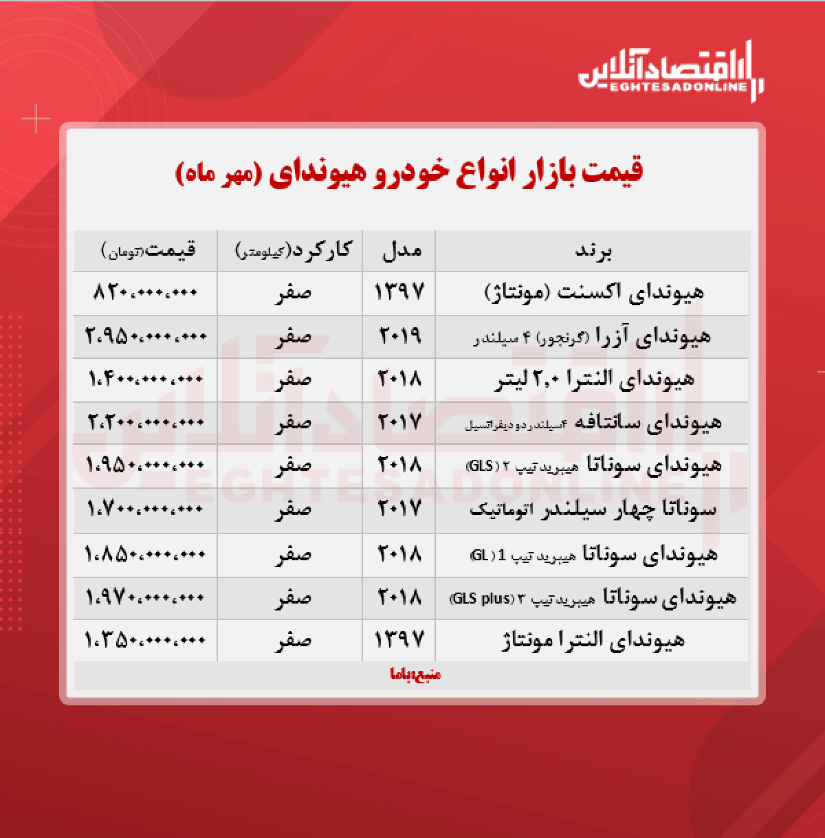 اقتصاد آنلاین - پیام مصطفایی: در جدول زیر قیمت روز انواع هیوندای در بازار آزاد را مشاهده میکنید.
