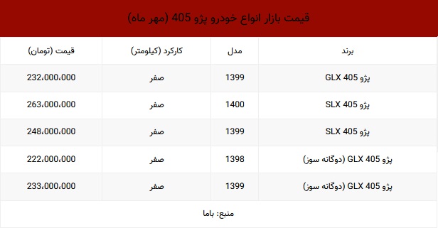 برند مدل کارکرد (کیلومتر) قیمت (تومان) پژو 405 GLX 1399 صفر 232،000،000 پژو 405 SLX 1400 صفر 263،000،000 پژو 405 SLX 1399 صفر 248،000،000 پژو 405 GLX (دوگانه سوز) 1398 صفر 222،000،000 پژو 405 GLX (دوگانه سوز) 1399 صفر 233،000،000 منبع: باما ارسال نظرات