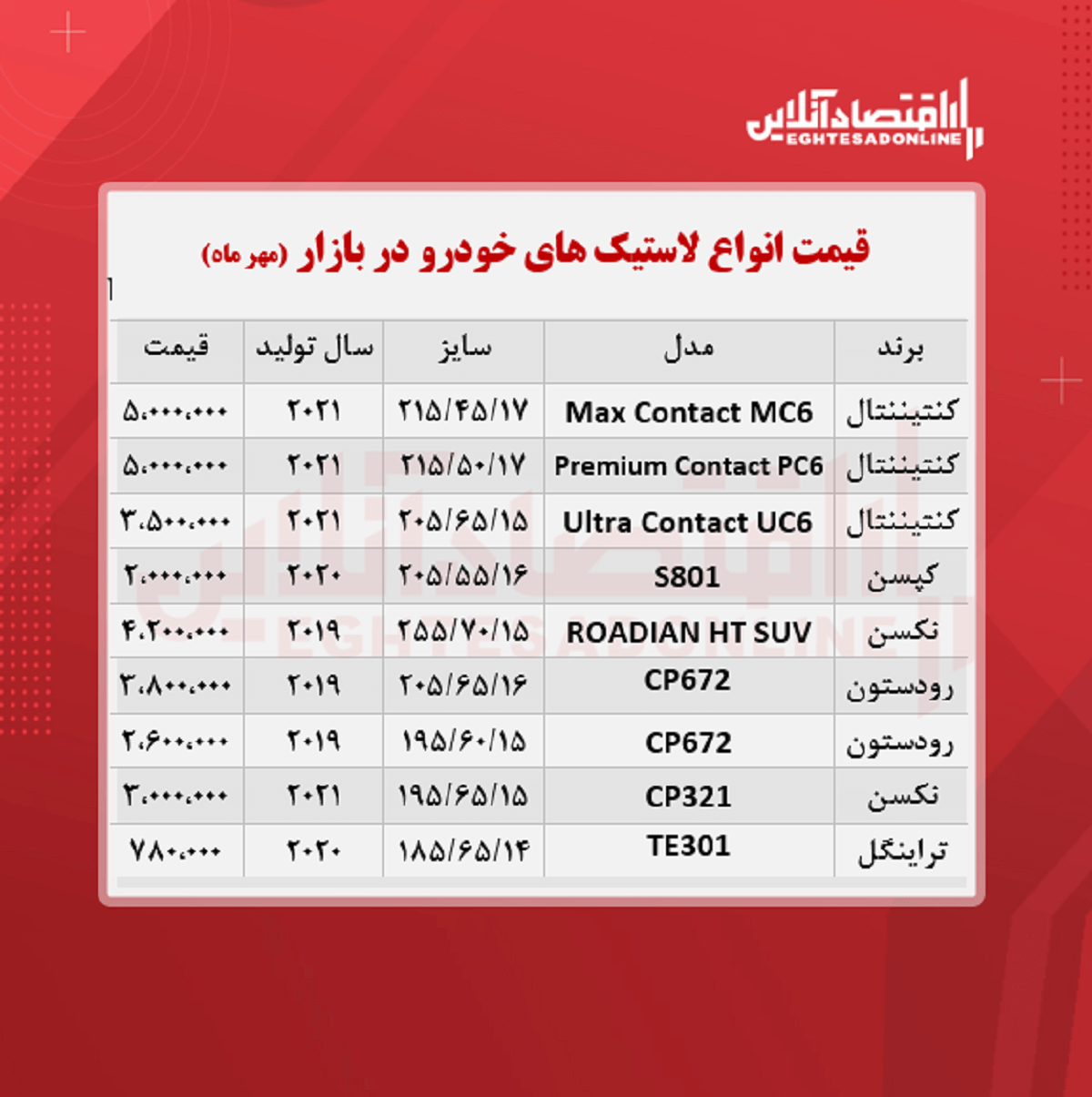 اقتصادآنلاین – فائزه بهرامی: قیمت جدید انواع لاستیک خودرو در سطح بازار تهران به شرح جدول زیر است؛