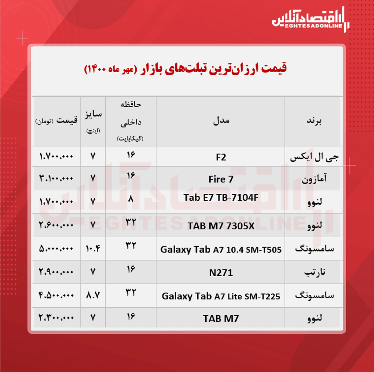 اقتصاد آنلاین – فائزه بهرامی: آنچه در زیر میآید قیمت روز ارزانترین تبلتها در سطح بازار تهران در مهرماه است؛