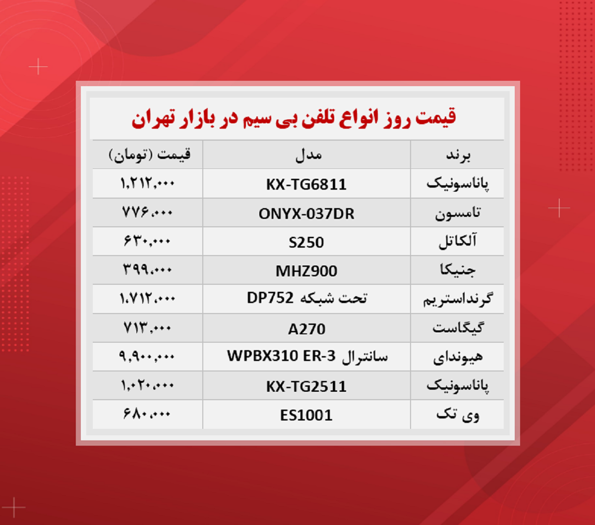اقتصادآنلاین – سمانه باقری: آنچه در زیر می‌آید قیمت انواع تلفن بی سیم در بازار تهران به شرح جدول زیر است؛