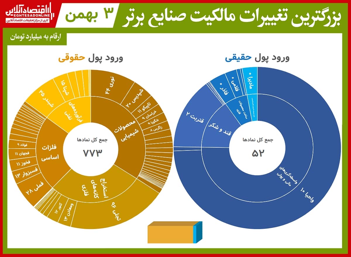 امروز افزایش سهام حقیقی‌ها در ۱۳نماد و افزایش سهام حقوقی‌ها در ۱۲۱نماد به بیش از یک میلیارد تومان رسید که جمع تغییر مالکیت دسته اول ۵۰میلیارد تومان و تغییر مالکیت دسته دوم ۷۷۰میلیارد تومان بود.