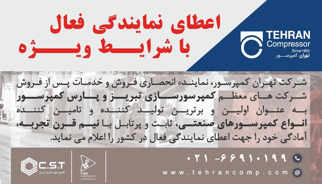 شرکت تهران کمپرسور، نماینده انحصاری فروش و خدمات پس از فروش شرکت های کمپرسورسازی تبریز و پارس کمپرسور به عنوان اولین و برترین تولید کننده و تامین کننده انواع کمپرسورهای صنعتی، ثابت و پرتابل با نیم قرن تجربه، آمادگی خود را جهت اعطای نمایندگی فعال در کشور را اعلام می نماید.