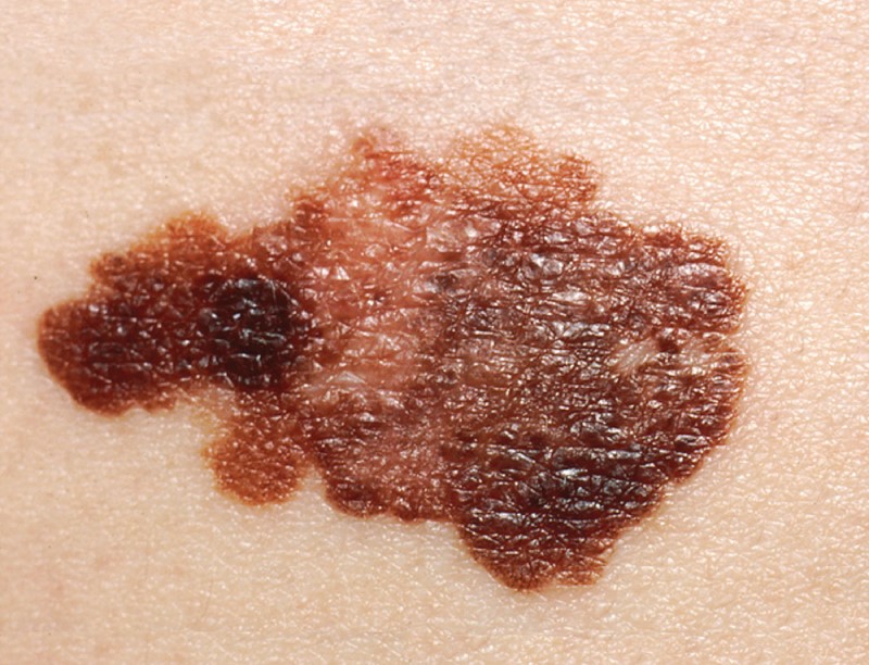 تصویر زیر، از یک تومور سرطانی پوست ملانوما (melanoma) است. همانطور که مشاهده می کنید، این نوع خال ها اغلب شکلی نامنظم و غیر عادی دارند و چند رنگ هستند.
