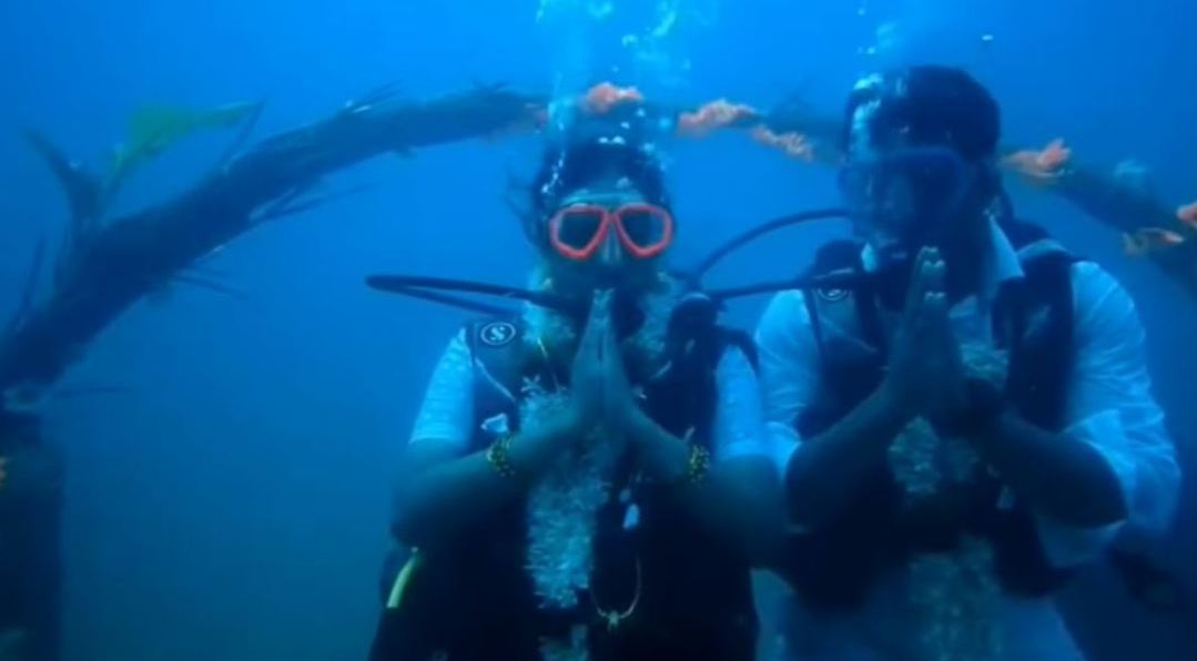این زوج عاشق غواصی در زیر آب در سواحل اسپانیا ازدواج کردند. این مراسم با حضور یک کشیش برگزار شد و حتی کیک و یک بطری شامپاین نیز در مراسم وجود داشت.
