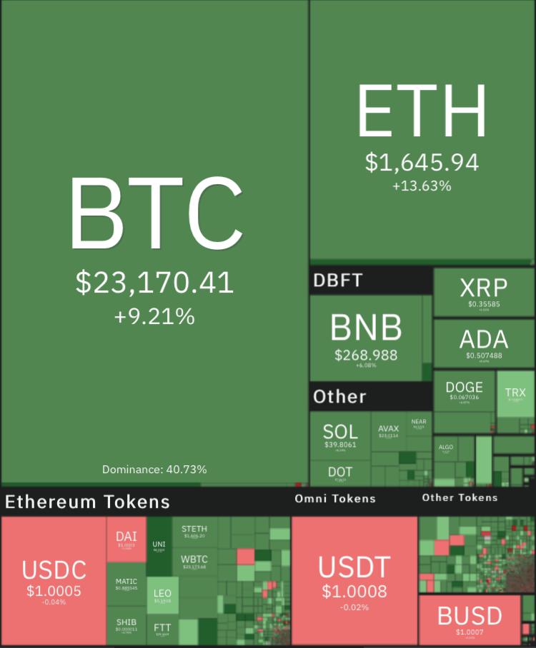 بیتکوین با رشد بیش از ۹ درصد به قیمت ۲۳ هزار و ۱۷۰ دلار و اتریوم با جهش حدود ۱۴ درصد به قیمت هزار و ۶۴۵ دلار معامله میشوند.