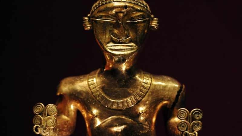 (اِل دورادو، شهر افسانه‌ای طلا که بسیاری از فاتحان اروپایی را برای جستجوی گنجینه‌هایی نظیر این بطری سنگ آهکی به شکل انسان به سرتاسر آمریکایی جنوبی کشاند.)