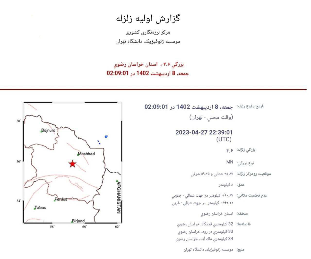 به گزارش اقتصادآنلاین، دقایقی پیش زلزله ای به بزرگی ۴.۶ در مقیاس ریشتر در نزدیکی قدمگاه، مشهد را لرزاند.